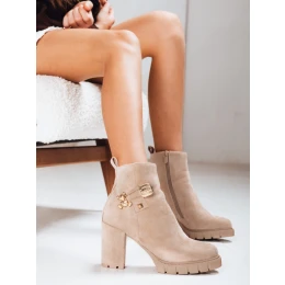 Eleganckie botki na wysokim obcasie, wykonane z delikatnego zamszu ekologicznego. Stylowy fason z ozdobnymi złotymi detalami dodaje całości szyku i kobiecego charakteru. Model łączy w sobie elegancję i wygodę, dzięki czemu idealnie sprawdza się zarówno w codziennych, jak i bardziej eleganckich stylizacjach.