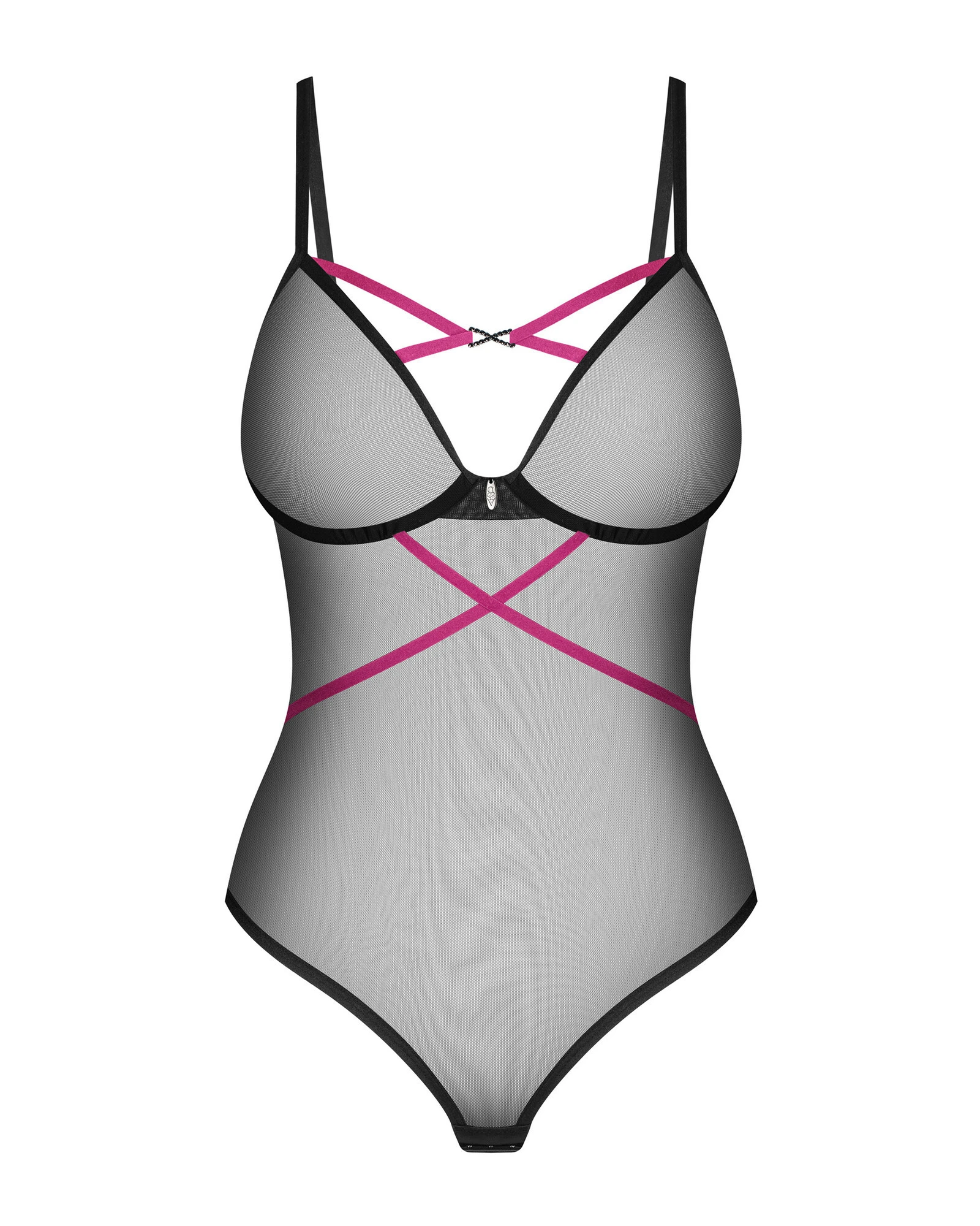 Sexy minimalismus s fialovými akcenty – to je kombinace, která určitě zanechá dojem! Toto body má klasický přiléhavý střih. Materiál, vyříznutý vysoko na hýždích, spolu s kosticemi zaručuje svůdný vzhled. Fialové ramínka se lehce ovíjejí kolem pasu a svůdně se kříží mezi košíčky, přitahujíce pohledy. Cítíte se sebevědomě v prádle Novenes a vytvářejte vzpomínky plné intimity.