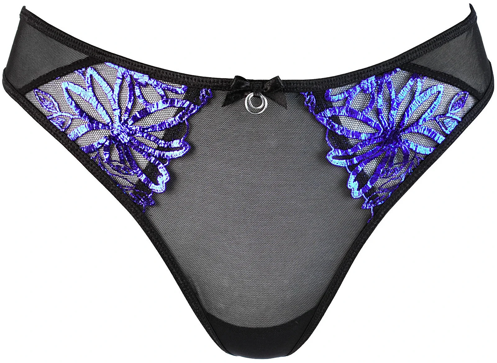 Elegantní a smyslná tanga z modročerné výšivky, která má třpytivý efekt, působí velmi okouzlujícím dojmem. Výšivka jim dodává jemnost a zároveň zdůrazňuje jejich exkluzivní charakter. Tanga mají navíc jako ozdobu kovový kroužek, což je detail, který jim dodává originalitu a jedinečný nádech. Kovový prvek je zároveň zajímavým kontrastem k výšivce a vytváří harmonickou kombinaci, zatímco zadní část kalhotek je vyrobena z jemného černého tylu.