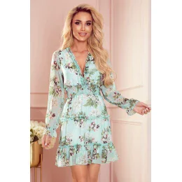 Šifónové šaty s elastickým pásom a volánmi. jemné volány po celých šatách. kvetinový vzor na zelenom pozadí. vyrobené zo šifónu príjemného na dotyk s podšívkou (95% polyester, 5% elastan). značka numoco. poľská výroba.