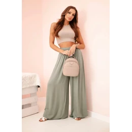 Dámske široké viskózové nohavice s elastickým pásom khaki