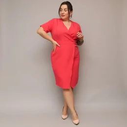 Dámske skladané obálkové šaty v koralovej farbe s dĺžkou po kolená (743)