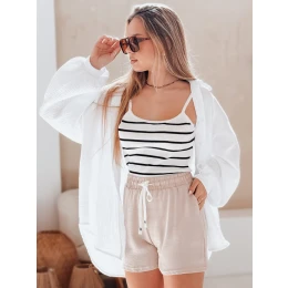 Damskie spodenki materiałowe o luźnym kroju i wysokim stanie to doskonała baza do tworzenia letnich stylizacji. Dzięki elastycznej gumce w pasie oraz troczkom z ozdobnymi końcówkami, świetnie dopasowują się do sylwetki. Dwie kieszenie z przodu dodają im casualowego charakteru. Wykonane z lekkiej tkaniny, sprawdzą się zarówno podczas spacerów po plaży, jak i w miejskim klimacie.