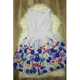 Exkluzivní společenské dámské šaty. Tento model šatů je bez rukávů s kulatým výstřihem. Přední část v oblasti dekoltu je tvořena jako dvouvrstvá, první vrstvu tvoří neprůhledný mateiál, druhý vrstva je jemná síťovina pošitá ornamenty. Sukénka je krásně vzdušná, skládaná a květinová, podšívku tvoří tyl. Sukně má i kapsy. Součástí je i pásek, který si můžete libovolně zavázat. Zapínání je řešeno v zadní partii všitým zipem. Obléct si tyto šaty můžete na společenské události, jako jsou plesy, návštěvy divadla a podobně orinetované události. Oblečte si je zkrátka tam, kde chcete být vidět.