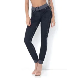 Dámske športové bezšvové džínsy so sťahovacou šnúrkou v páse a manžetovým zakončením nohavíc v spodnej časti. Vyrobené z mäkkého elastického materiálu, ktorý sa dokonale prispôsobí telu. Technológia použitá na vytvorenie týchto džínsov je použiteľná len na bezšvové výrobky. Špeciálny dizajn na zadnej strane vytvára prirodzený efekt zdola nahor - nadvihuje a zvýrazňuje zadok. Veľmi dobrá pevnosť a odolnosť voči praniu.