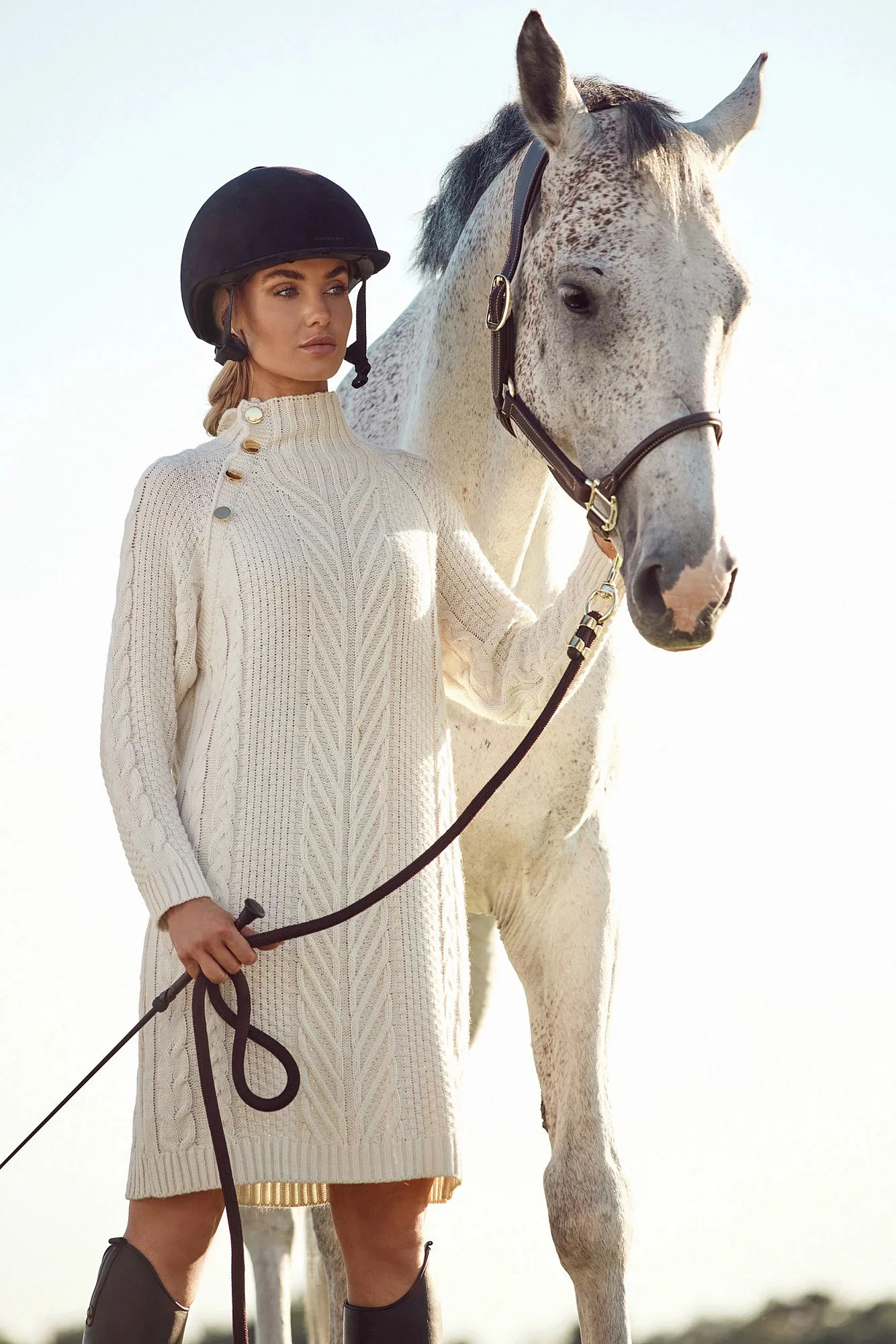 Elegantní a útulné svetrové šaty s ozdobnými zlatými knoflíky ve vysokém límci jsou základem šatníku.