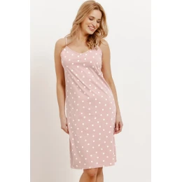 Damska koszula nocna Karen 3420 marki Taro to połączenie elegancji i komfortu. Wykonana w 100% z wysokogatunkowej bawełny, zapewnia doskonałą przewiewność i miękkość, idealną na ciepłe noce. Subtelny wzór w kropki nadaje jej delikatnego, kobiecego charakteru.