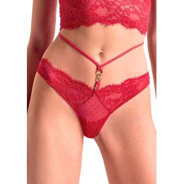 Očarujúce tangá v tmavočervenej farbe, ktoré kombinujú jemnú čipku s modernými detailmi. Prednú časť zdobí zmyselný priehľadný tyl s bodkovaným vzorom a rafinovaný pás, ktorý zvýrazňuje pás a dodáva celému modelu odvážny nádych. Kovové zdobenie na prednej strane vytvára luxusný dojem a robí z tohto kúsku skutočne výnimočný kus spodnej bielizne. Ideálne na špeciálne príležitosti a ako výrazný doplnok vašej zbierky.