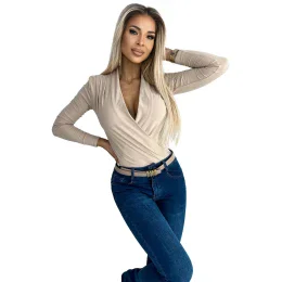 Dámske body 375-7 NUMOCO - béžová farba - z príjemného materiálu - dlhé rukávy - hlboký výstrih do V