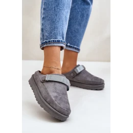 Dámské pantofle vyrobené z eko semiše. Umístěny na platformě. Vnitřek je zateplen příjemným kožíškem, což zajišťuje komfort v chladnějších dnech. Navíc mají pohyblivý pásek na suchý zip, který stabilizuje patu a umožňuje dokonalé přizpůsobení. Ideální na každodenní nošení, kombinují styl s funkčností. Při výběru velikosti se řiďte tabulkou velikostí.