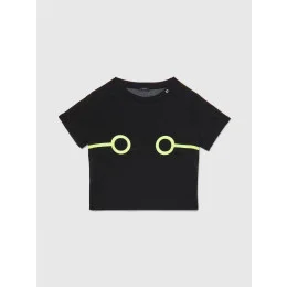 Mäkké tričko zo strečové sieťoviny s fluorescenčnými obrysy. Okrúhly výstrih je zvýraznený kovovým logom D.