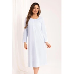 Dámska nočná košeľa 016 J/25 je klasický model vytvorený s ohľadom na pohodlie a funkčnosť. Je vyrobená z vysokokvalitnej 100 % bavlny pre úplnú priedušnosť a jemnosť na pokožke, má dlhé rukávy a sedlo s čiastočným zapínaním na gombíky pre jednoduché obliekanie a nenápadný pôvab. Strih košele je voľný a ležérny, takže je vhodná na spanie aj pohodlné domáce nosenie a ideálna pre tehotné ženy alebo dojčiace matky.