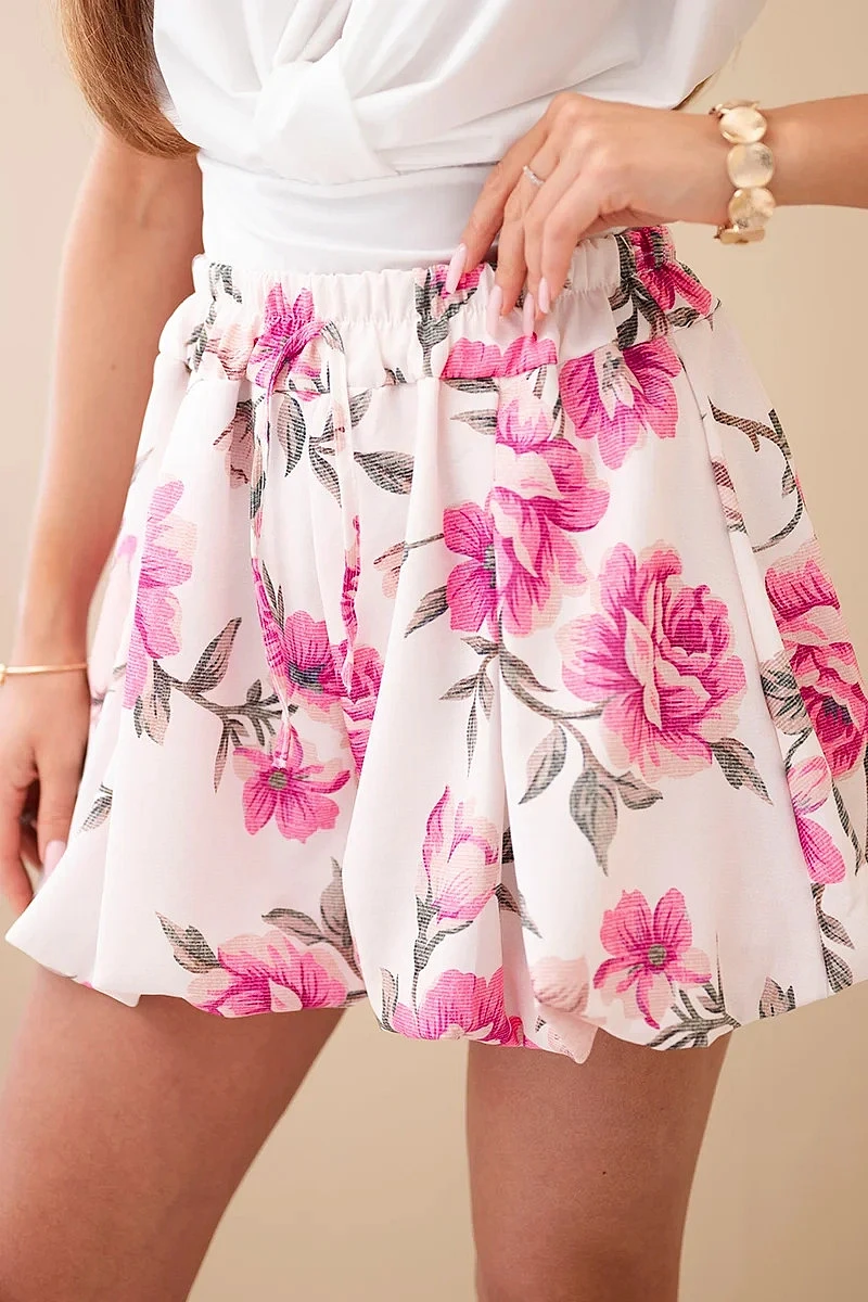 Dámske viskózové šortky s kvetinovým vzorom a viazaním v páse ružové
