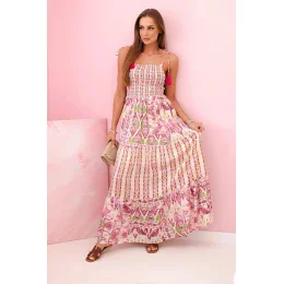 Hledáte ideální šaty na léto, dovolenou nebo festivaly? Tyto dámské maxi šaty na ramínka jsou skvělou volbou pro ženy, které si cení pohodlí a originálního stylu. Vyrobeny ze 100% lehké a prodyšné viskózy, zajišťují pohodlí i v nejteplejších dnech. Módní etnický vzor a šťavnaté barvy zajistí, že v davu rozhodně vyniknete. Horní část šatů je z elastické gumy, která se krásně přizpůsobí postavě, a nastavitelné ramínka s ozdobnými střapci dodávají šarm. Spodní část s volánem dodává lehkost a romantický charakter. Tento model je ideální na pláž, procházky i letní setkání s přáteli. Velikost je univerzální a vhodná pro ženy velikosti S, M nebo L.