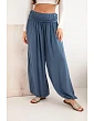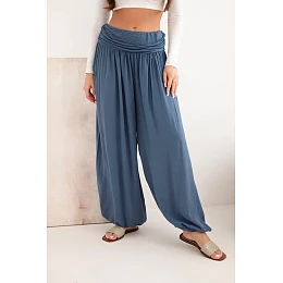 Tieto výnimočné dámske nohavice so širokými nohavicami a jemným riasením sú ideálnou voľbou na každodenné nosenie a iné príležitosti. Sú vyrobené zo 100 % mäkkej viskózy, ktorá zaručuje ľahkosť a pohodlie aj počas teplejších dní. Elastický pás poskytuje pohodlie a dokonalé prispôsobenie, zatiaľ čo voľný strih umožňuje voľnosť pohybu a moderný vzhľad. Model zakončený elastickou nohavicou v spodnej časti nohavíc dodáva nohaviciam jedinečný charakter a jemne zvýrazňuje postavu. Skvelá voľba na prechádzku, nákupy alebo relax v pohodlí domova. Vďaka jednoduchému strihu a neutrálnym farbám ich ľahko zladíte s rôznymi štýlmi - od športového až po ležérny. Veľkosť je univerzálna a bude vyhovovať ženám vo veľkosti S, M alebo L.