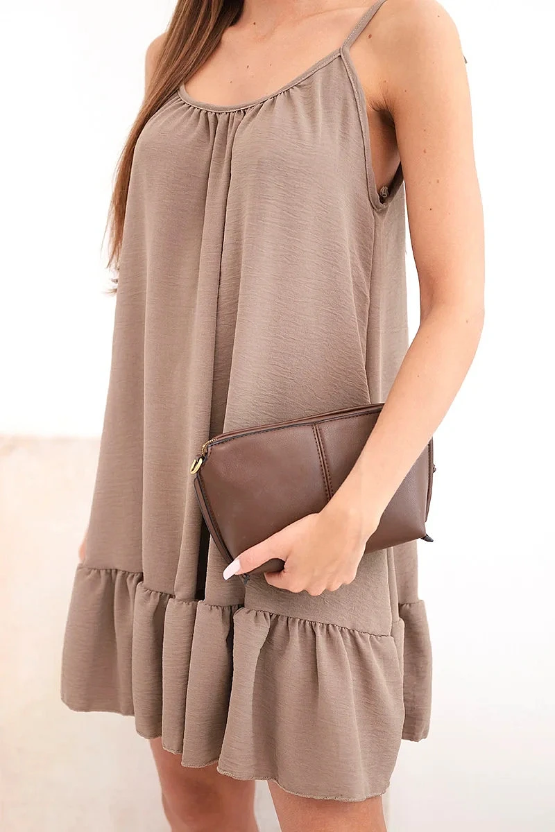 dámske šaty bez ramienok s volánom a zaväzovaním sú skvelou voľbou pre ženy, ktoré ocenia pohodlie a módny letný štýl. Ľahký a vzdušný materiál zaručuje, že model je ideálny na teplé dni a poskytuje pohodlie počas celého dňa. Šaty majú tenké ramienka s nastaviteľným zaväzovaním, ktoré umožňujú dokonalé prispôsobenie postave. Vrchná časť je jemne nariasená, vďaka čomu sa krásne prispôsobí poprsiu a dodáva celku ležérnu ženskosť.
