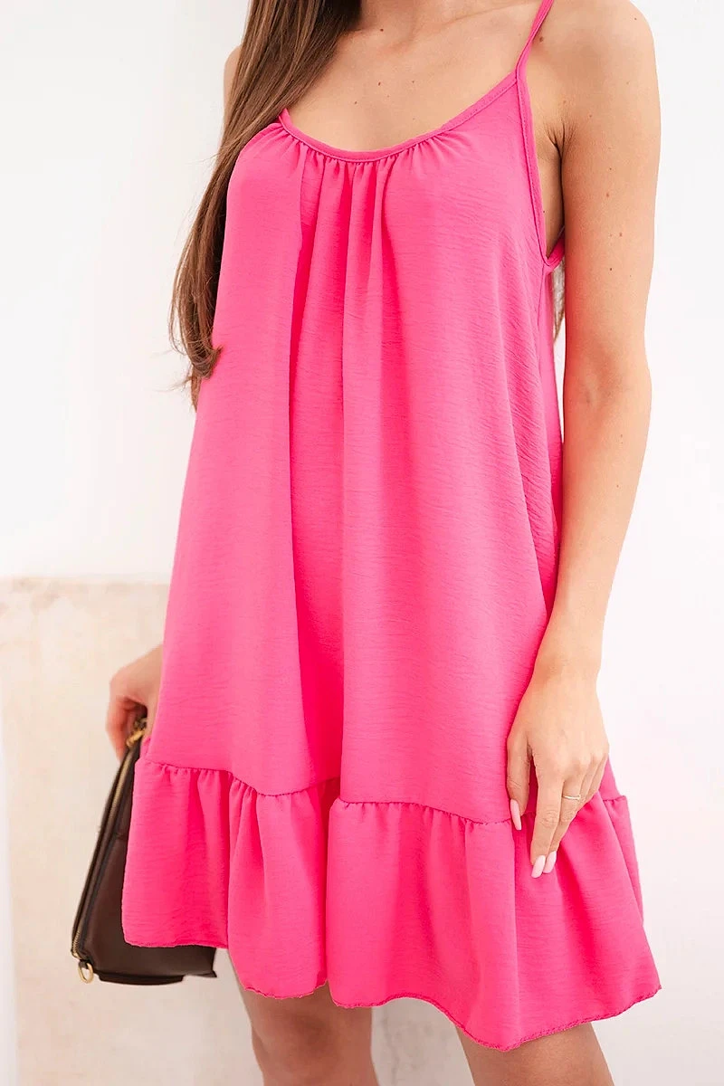 dámske šaty bez ramienok s volánom a zaväzovaním sú skvelou voľbou pre ženy, ktoré ocenia pohodlie a módny letný štýl. Ľahký a vzdušný materiál zaručuje, že model je ideálny na teplé dni a poskytuje pohodlie počas celého dňa. Šaty majú tenké ramienka s nastaviteľným zaväzovaním, ktoré umožňujú dokonalé prispôsobenie postave. Vrchná časť je jemne nariasená, vďaka čomu sa krásne prispôsobí poprsiu a dodáva celku ležérnu ženskosť.