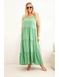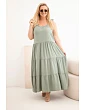 Šaty jsou vyrobeny ze 100% viskózy, díky čemuž jsou mimořádně prodyšné, lehké a příjemné na pokožce. Přírodní materiál zajišťuje, že se model skvěle hodí do horkých dnů a poskytuje pohodlí i volnost pohybu po celý den. Volný střih a rozšířený spodní lem jemně maskují nedokonalosti postavy a zároveň zdůrazňují ženskost a lehkost stylizace. Jemně mačkaná struktura materiálu odpovídá aktuálním trendům a dodává celku nenucený styl.