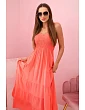 Tieto dámske maxi šaty sú ideálnou voľbou na teplejšie dni - očaria svojou ľahkosťou, ženským strihom a pohodlným nosením. Elastický, nariasený vrchný diel sa krásne prispôsobí postave, zvýrazní pás a poprsie a rozšírená spodná časť dodá celku ľahkosť a voľnosť. Sú vyrobené zo 100 % priedušnej viskózy a zaručujú pohodlie počas celého dňa - či už si ich vyberiete na prechádzku, dovolenku alebo stretnutie s priateľmi. Model je veľmi ženský a univerzálny - vyzerá skvele samostatne alebo v kombinácii s džínsovou bundou či sandálmi. Jemné nariasenie dodáva šatám pôvab a zaručuje efektný vzhľad. Veľkosť je univerzálna a bude vyhovovať ženám vo veľkosti S, M alebo L.
