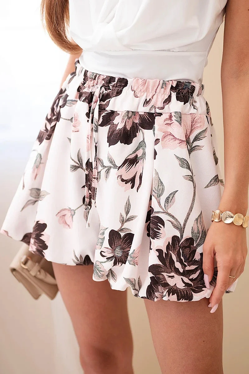 Dámske viskózové šortky s kvetinovým vzorom a viazaním v páse hnedé