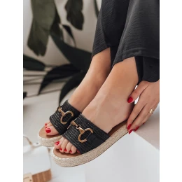 Modne klapki damskie z wyraźnym, złotym akcentem i plecioną platformą tworzą letni must-have. Szeroki pasek gwarantuje komfort i stabilność. To idealna propozycja na codzienne stylizacje w upalne dni – sprawdzą się na mieście i na wakacjach.