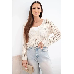 Dámsky sveter so zapínaním na gombíky je mimoriadne praktický a všestranný - možno ho nosiť ako klasický sveter alebo ako ľahký prehoz cez top alebo tričko. Dlhé rukávy a jemne vypasovaný strih zaručujú pohodlie počas celého dňa bez ohľadu na príležitosť. Ažurová štruktúra materiálu zaručuje priedušnosť, takže je ideálny na prechodné ročné obdobia.