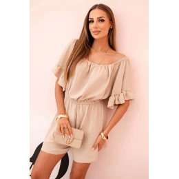 Tento dámský overal typu hiszpanka je efektní a ženský návrh ideální na letní dny. Odkryté ramena krásně zvýrazňují siluetu, a volánky na rukávech dodávají celku lehkost a módní charakter. Elastická guma v pase zajišťuje pohodlí při nošení a opticky zeštíhluje postavu.