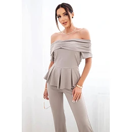 Tento elegantný dámsky komplet je ideálnou voľbou pre ženy, ktoré chcú vyzerať štýlovo a žensky. Komplet pozostáva z efektnej blúzky Carmen a dlhých nohavíc so širokými nohavicami, ktoré vytvárajú módny a zladený outfit. Blúzka má krásny padavý výstrih s volánom, ktorý jemne odhaľuje ramená a dodáva romantický nádych. Priliehavý strih s mierne rozšírenou spodnou časťou zvýrazňuje pás a dodáva ľahkosť.