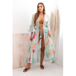 Dámská přehozená halenka ve stylu boho je ideálním doplňkem letních outfitů. Vyrobena ze 100% prodyšné bavlny, zaujme nejen pohodlím, ale i originálním designem. Hluboký výstřih do V zdobený krajkou a dekorativními detaily dodává půvab a ženský charakter. Zavazování v pase ozdobnou šňůrkou s třásněmi umožňuje přizpůsobení postavě a zvýraznění jejích předností. Volný střih s rozšířenými 3/4 rukávy působí velmi lehce a stylově. Barevné, etnické vzory dodávají celku prázdninovou atmosféru – ideální na pláž, přes plavky, na letní procházky nebo jako stylový doplněk ke každodennímu outfitu. Velikost je univerzální a vhodná pro ženy velikostí S, M nebo L.