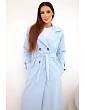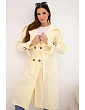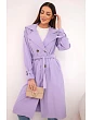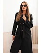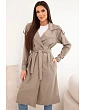 Tento štýlový dámsky kabát v klasickom strihu je nevyhnutnou súčasťou šatníka každej ženy. Model s efektným širokým golierom, viazaným opaskom v páse a dvojitým radom gombíkov odkazuje na nadčasový štýl trenčkotov. Dĺžka nad kolená a zúžený pás krásne zvýrazňujú siluetu a dodávajú celku eleganciu. Rukávy s ozdobnou manžetou a jemné nariasenie na ramenách dodávajú kabátu ľahkosť a ženský charakter.