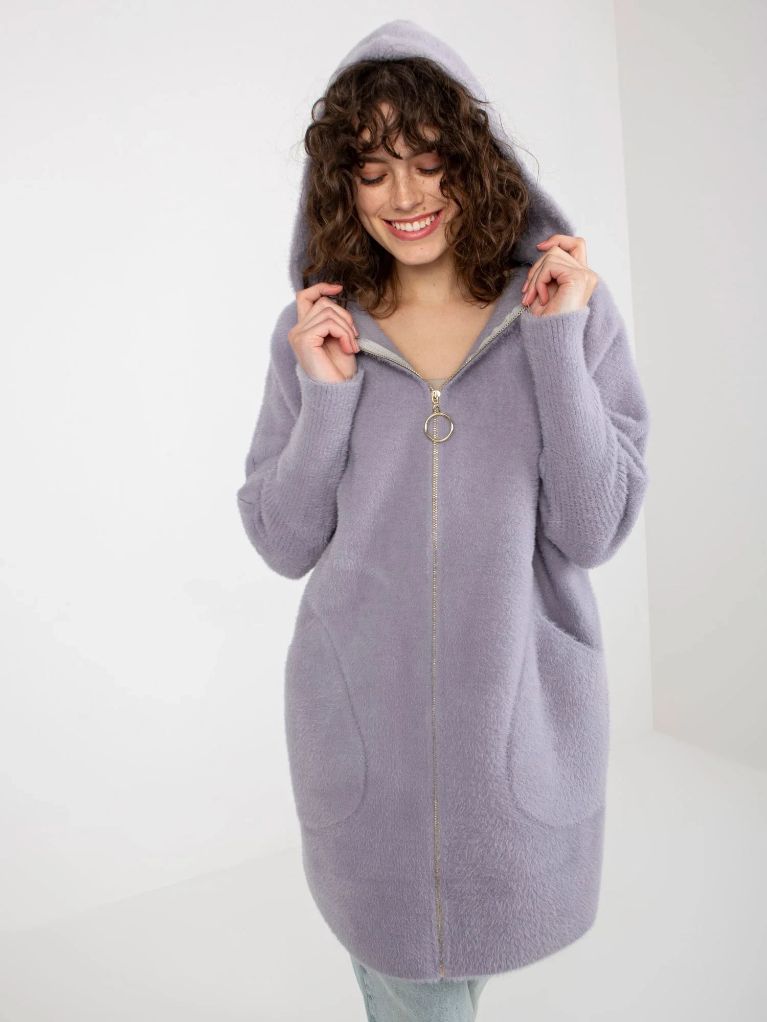 Svetlo fialový dámsky kabát z alpaky s kapucňou .
