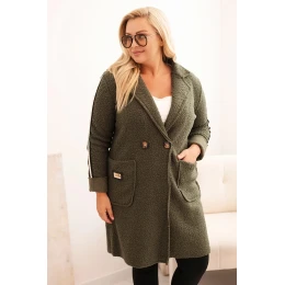 Teplý a útulný dámsky kabát Plus Size z mäkkého materiálu imitujúceho umelú ovčiu vlnu je ideálnou voľbou na chladnejšie dni. Nadrozmerný strih sa dokonale prispôsobí siluete a zaručuje pohodlie pri nosení. Má klasický golier, dvojradové zapínanie na gombíky a praktické hlboké vrecká s ozdobnou aplikáciou.