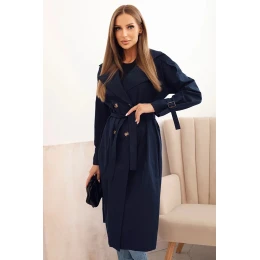 Tento štýlový dámsky kabát v klasickom strihu je nevyhnutnou súčasťou šatníka každej ženy. Model s efektným širokým golierom, viazaným opaskom v páse a dvojitým radom gombíkov odkazuje na nadčasový štýl trenčkotov. Dĺžka nad kolená a zúžený pás krásne zvýrazňujú siluetu a dodávajú celku eleganciu. Rukávy s ozdobnou manžetou a jemné nariasenie na ramenách dodávajú kabátu ľahkosť a ženský charakter.