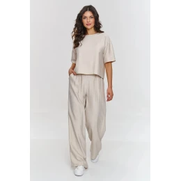 Tento elegantní set je ideální volbou pro jarní a letní dny, kdy chcete spojit módní vzhled s vysokou kvalitou zpracování. Sada obsahuje volnou blůzu ve tvaru krabice, která skvěle ladí s elegantními stylizacemi. Krátký rukáv a jednoduchý střih blůzy z ní dělají skvělou volbu pro formální i méně formální události, spojující eleganci s pohodlím. Kalhoty se vyznačují širokými nohavicemi, které dodávají stylizaci moderní a elegantní vzhled. Elastický pas zajišťuje pohodlné nošení a jejich délka dodává celku eleganci a styl. Model je vyroben z jemného a lehkého materiálu imitujícího len. Jednoduchý, ale vybroušený střih dává setu nadčasový charakter, který bude vypadat stylově na každé postavě. Sada se skvěle hodí na obchodní schůzky, elegantní události nebo výlety do města, kdy záleží na spojení elegance a volnosti. Můžete ji zkombinovat s podpatky, elegantními sandály nebo bílými teniskami.