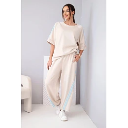 Mikina volného střihu má rukávy s ozdobnými lampasy, které celku dodávají moderní charakter. Kalhoty s elastickým pasem a bočními lampasy opticky zeštíhlují nohy. Komplet se skvěle hodí na běžné nošení, na procházku, nákupy nebo na cesty.