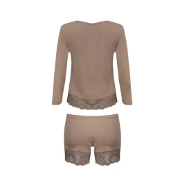 Blůza má dlouhé rukávy a půlkulatý výstřih. Komplet doplňují krátké šortky. Spodní okraj blůzy a nohavice jsou obšité krajkou.