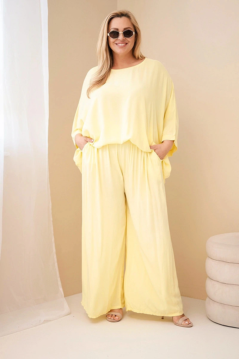 Dámský komplet Plus Size z viskózy se širokými kalhotami a halenkou žlutý