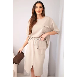 Stylový dámský máslový komplet je ideální volbou pro ženy, které si cení pohodlí a módního vzhledu v jednom. Souprava se skládá z volného topu s krátkým rukávem a přiléhavé midi sukně s elastickým pasem. Hladký materiál s příjemnou, měkkou strukturou se krásně přizpůsobí postavě a zajišťuje pohodlí po celý den. Ozdobná kapsa typu cargo na topu i sukni dodává celku moderní charakter a zavazování v pase zvýrazňuje ženskou siluetu.