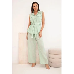 Stylový dámský komplet je vynikající nabídkou pro ženy, které si cení pohodlí, módního vzhledu a univerzálních řešení v každodenních stylizacích. Model se skládá z halenky bez rukávů zapínané na knoflíky a z dlouhých kalhot se širokými nohavicemi, díky čemuž celek působí lehce, ženskě a velmi moderně. Dalším plusem halenky je klasický límec, náprsní kapsy a pásek k zavazování v pase, který krásně zvýrazní postavu. Kalhoty mají pohodlnou gumu v pase, což zajišťuje komfort nošení a dobré přizpůsobení postavě.