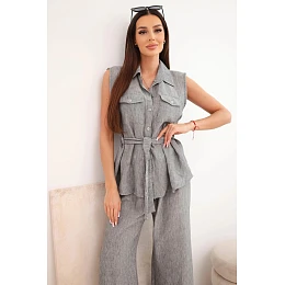 Táto štýlová dámska súprava je vynikajúcou ponukou pre ženy, ktoré oceňujú pohodlie, módny vzhľad a všestranné riešenia pri každodennom stylingu. Model pozostáva z blúzky bez rukávov so zapínaním na gombíky a dlhých nohavíc so širokými nohavicami, vďaka čomu je celý vzhľad ľahký, ženský a veľmi moderný. Ďalším plusom blúzky je klasický golier, náprsné vrecká a pás, ktorý krásne zvýrazňuje postavu. Nohavice majú pohodlný elastický pás, ktorý zaručuje komfort nosenia a dobré prispôsobenie sa postave.