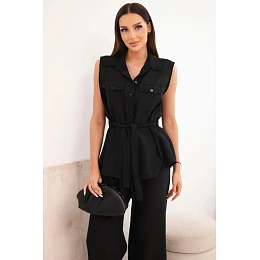 Táto štýlová dámska súprava je vynikajúcou ponukou pre ženy, ktoré oceňujú pohodlie, módny vzhľad a všestranné riešenia pri každodennom stylingu. Model pozostáva z blúzky bez rukávov so zapínaním na gombíky a dlhých nohavíc so širokými nohavicami, vďaka čomu je celý vzhľad ľahký, ženský a veľmi moderný. Ďalším plusom blúzky je klasický golier, náprsné vrecká a pás, ktorý krásne zvýrazňuje postavu. Nohavice majú pohodlný elastický pás, ktorý zaručuje komfort nosenia a dobré prispôsobenie sa postave.