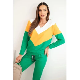 Tento dámsky športový komplet je kombináciou štýlu a pohodlia, ktorá je ideálna na každodenné nosenie, prechádzky, tréning alebo víkendový relax. Vrchný diel s efektným výstrihom do V a kontrastnými farebnými pruhmi priťahuje pozornosť a dodáva športový charakter. Nohavice klasického strihu so šnúrkou v páse a sťahovaním na šnúrku zaručujú pohodlie a perfektne sedia.