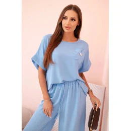 Dámska súprava z viskózy s ozdobným kvetom a širokými nohavicami - modrá