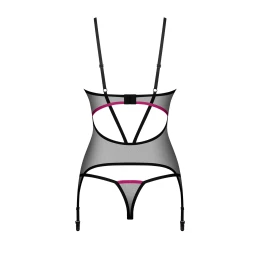 Jemné spodní prádlo, které svádí zajímavými detaily! Černý korzet a tanga z kolekce Novenes jemně obepínají ženské tělo. Díky této extrémně příjemné průsvitné látce, lesklému přívěsku mezi prsy, barevným ramínkům a integrovaným podvazkovým páskům budete po celou noc středem pozornosti.