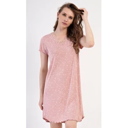 Dámska nočná košeľa Judita s krátkymi rukávmi. Nočná košeľa má pohodlnú dĺžku nad kolená a ozdobné riasenie okolo rukávov a spodného okraja. Výstrih je zdobený jemnou čipkou. Nočná košeľa s krátkymi rukávmi je potlačená drobnými kvetmi. Materiál zo zmesi viskózy a lycry je mäkký a hebký na dotyk.