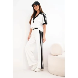 Mikina volného střihu má polo límec s ozdobnými knoflíky, které jí dodávají jemně elegantní charakter. Kalhoty se širokými nohavicemi krásně prodlužují postavu a elastický pas s nastavitelným šňůrkováním zaručuje perfektní přizpůsobení. Boční lampasy opticky zeštíhlují nohy a dodávají celku sportovní lehkost.