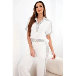 Mikina s voľným strihom má polo golier s ozdobnými gombíkmi, ktoré jej dodávajú jemne elegantný charakter. Široké nohavice krásne predlžujú postavu a elastický pás s nastaviteľnou šnúrkou zaručuje dokonalé prispôsobenie. Bočné lampasy opticky zoštíhľujú nohy a dodávajú celku športovú ľahkosť.