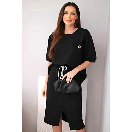 Táto štýlová dámska maslová súprava je ideálnou voľbou pre ženy, ktoré ocenia pohodlie a módny vzhľad v jednom. Súprava sa skladá z voľného topu s krátkymi rukávmi a priliehavej midi sukne s elastickým pásom. Hladký materiál s príjemnou, mäkkou štruktúrou sa krásne prispôsobí postave a zaručuje pohodlie počas celého dňa. Ozdobné cargo vrecko na topu a sukni dodáva súprave moderný nádych a zaväzovanie v páse zvýrazňuje ženskú siluetu.