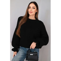 Dámsky mohérový sveter s hrubým úpletom a ozdobnými rukávmi čierny