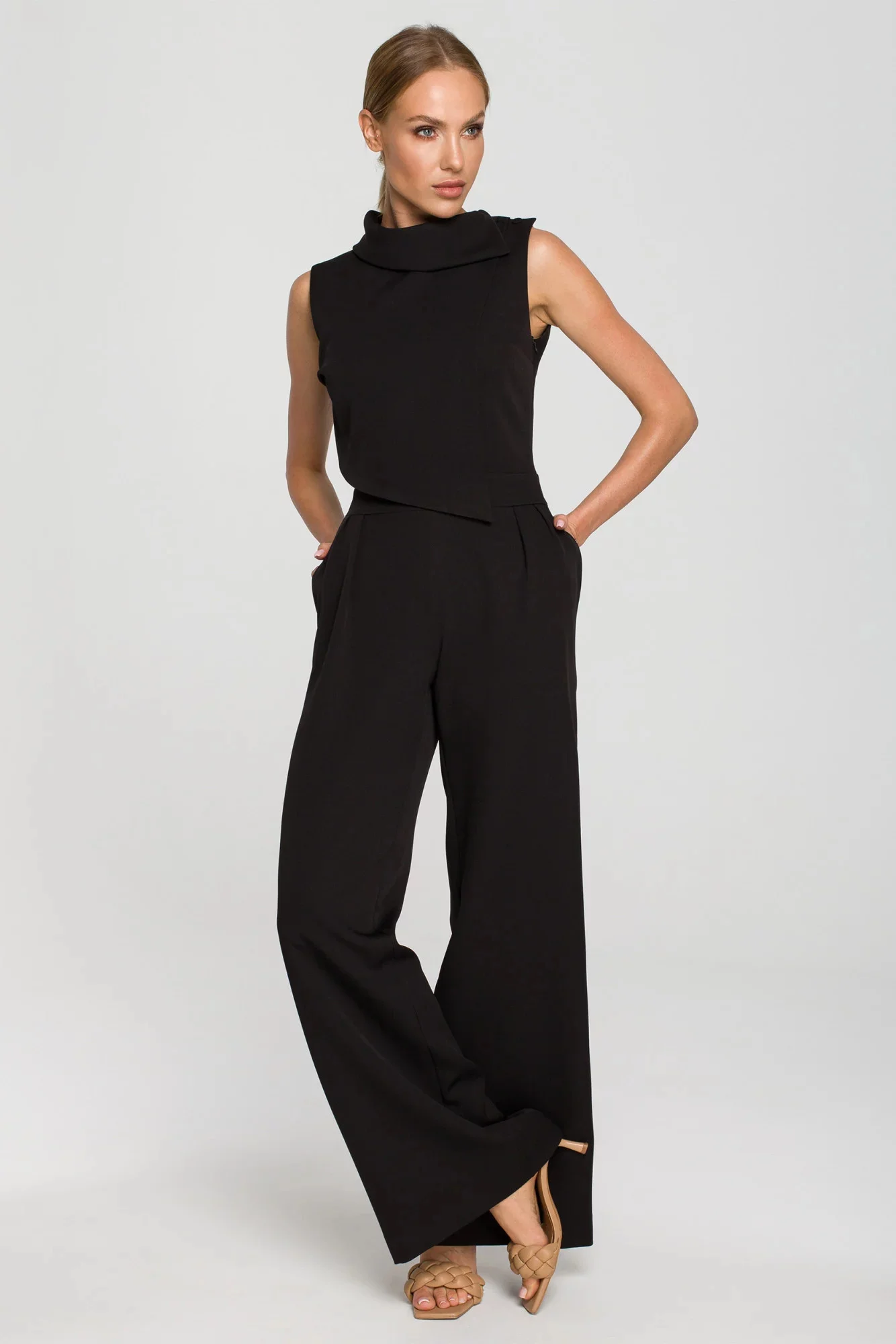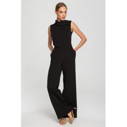 Buďte jedineční, keď si vyberiete tento originálny overal so širokými nohavicami a ozdobným dvojvrstvovým zvrškom bez rukávov s vysokým golierom a krásnym zapínaním na ramenách.